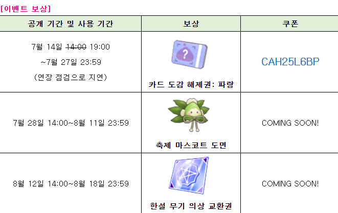 각 쿠폰 등록 시, 캐릭터 아이디를 잘못 입력하신 경우는 재발급이 불가능해요.