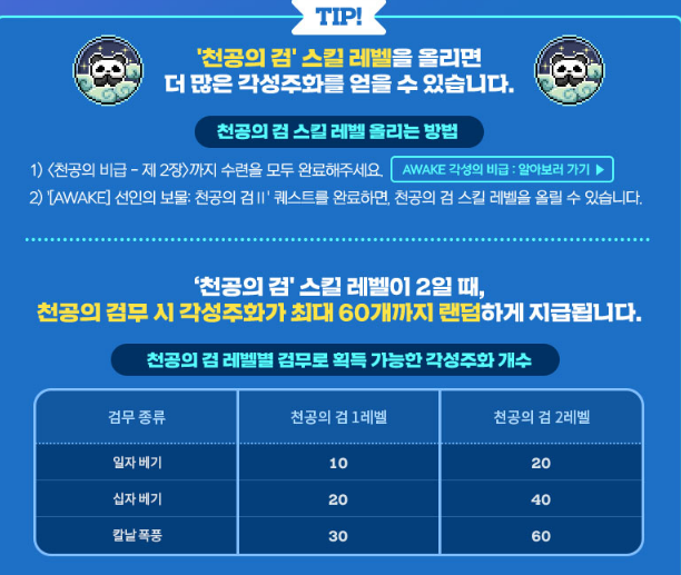 스킬이 활성화된 상태에서 레벨 범위 몬스터를 처치하시면 일정 확률로 검의 기운이 채워지면서 각성주화를