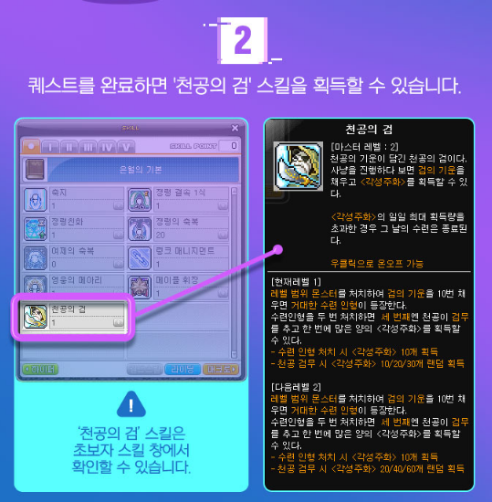 천공의 검 스킬은 초보자 스킬 창에서 확인을 하실 수 있습니다.