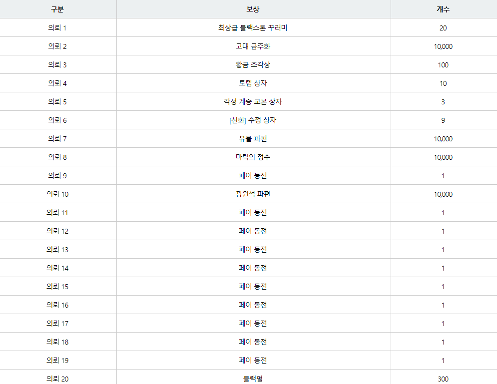 이렇게 보상으로는 페이동전,최상급 블랙스톤 꾸러미 ,고대 금주화 ,황금 조각상