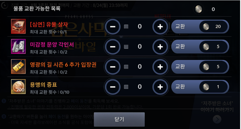그리고 페이동전으로 심연 유물 상자, 미감정 문양 각인서,영광의 길 시즌6 추가 입장권