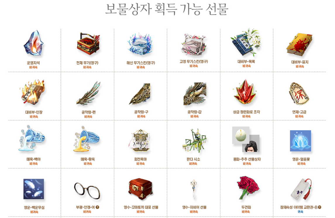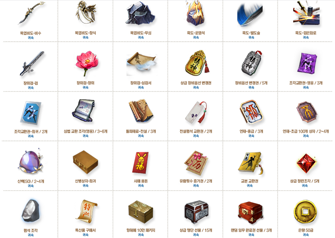 귀옥-하급 강화석500개,100만 수양단 5개,문심지백 규혈 강화재료 30개,백효생전 재료1세트