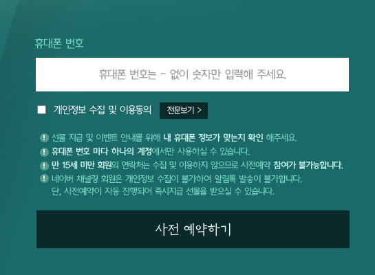 이렇게 간단하게 밑에 글 잘 읽어보시고 휴대폰 번호를 치신 후 사전 예약하기