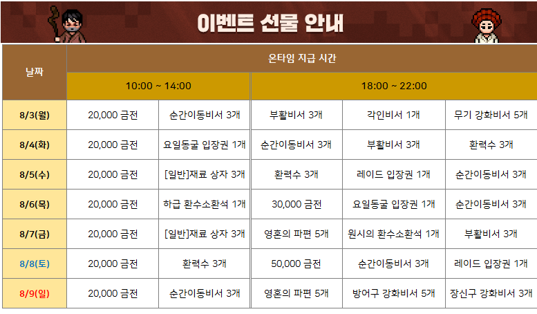 온타임 이벤트 선물 지급기간은 8월3일 월요일 오후6시~8월9일 일요일 오후11시 59분까지 입니다.