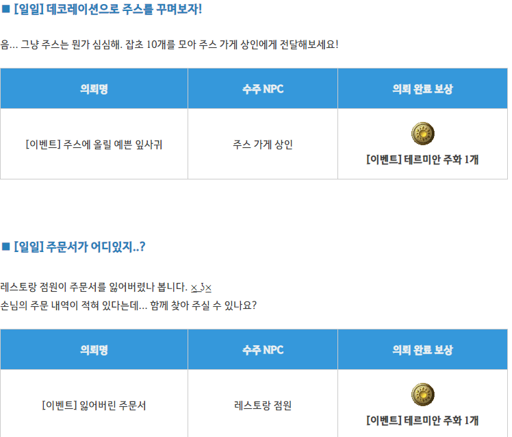 이벤트 의뢰 중 일일 의뢰로 표기된 의뢰는 가문당 1일1회 완료 가능하고,