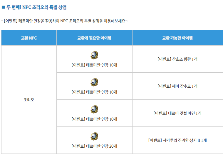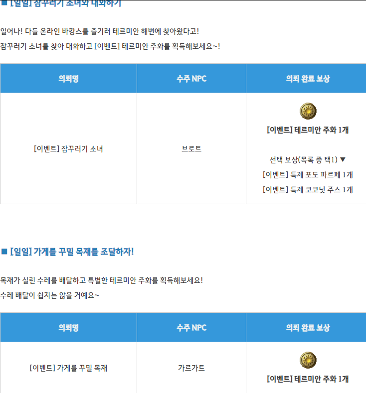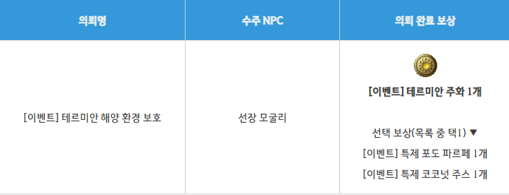 테르미안 해양 환경 보호 -테르미안 주화 1개,선택보상으로 특제 포도 파르페1개,특제 코코넛 주스1개