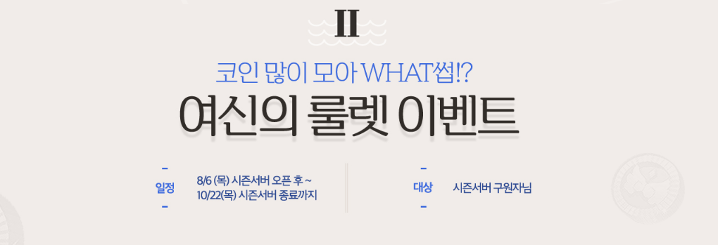 이벤트 기간은8월6일 시즌서버 오픈 후~ 10월22일 목요일 시즌서버 종료까지 입니다.