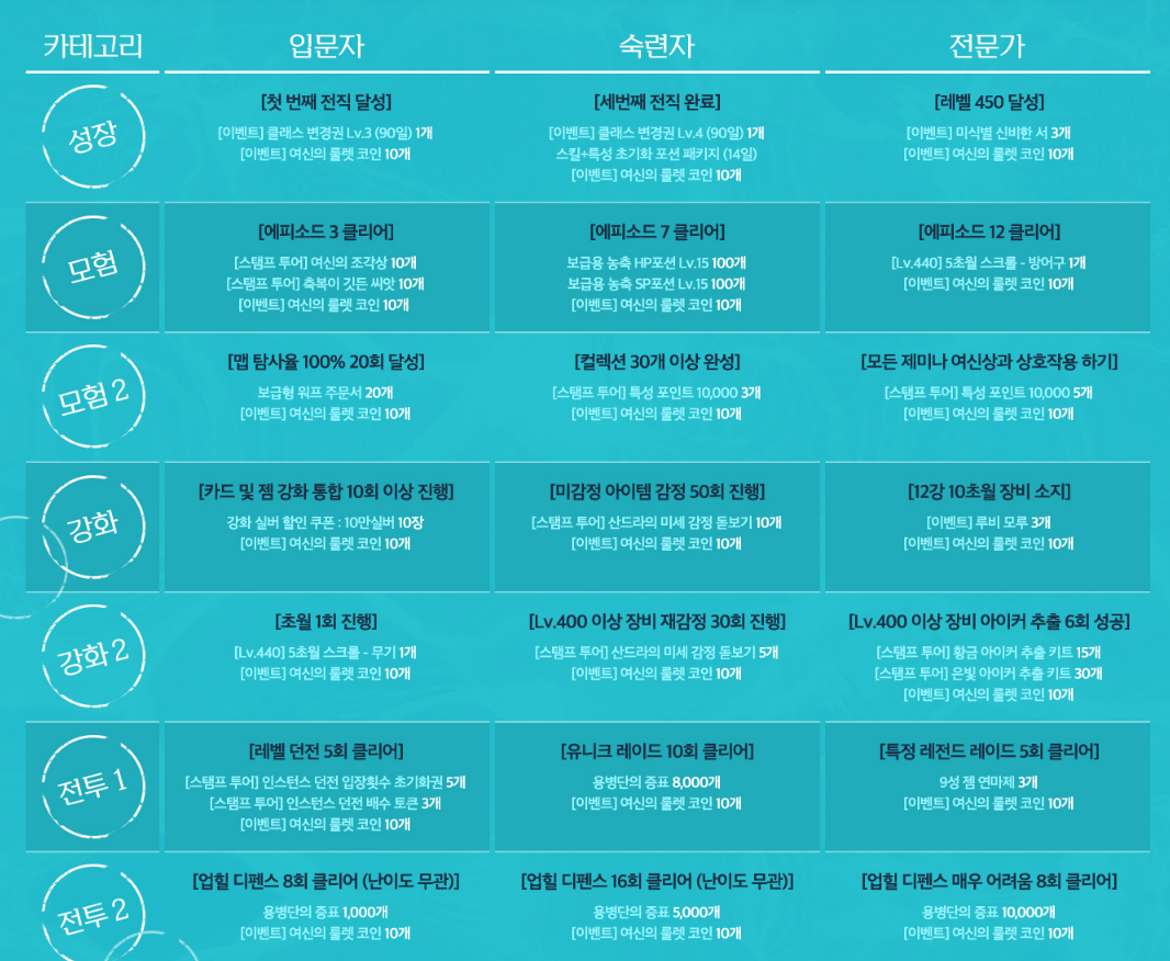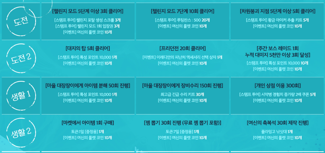 이렇게 성장,모험,강화,전투,도전,생활 미션을 클리어 하실 때마다 많은 이벤트 보상들이 있습니다.