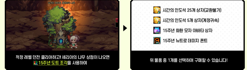적정 레벨 던전 클리어하고 세리아의 나무 상점이 나오면 15주년 도트 조각을 사용하여