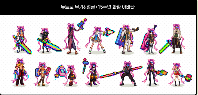 뉴트로 무기&얼굴+15주년 화환 아바타까지 있습니다. 약간 촌스럽긴 한데 뭔가 뉴트로 감성으로