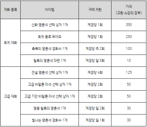 영웅 칠흑의 영혼석,빛나는 영혼석 정화수를 교환이 가능하고,