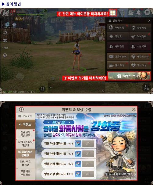 이벤트 보상은 영웅 이상 장비 강화 시도를 3/6/9/12/15/18/21/24/27/30회를 완료하시면
