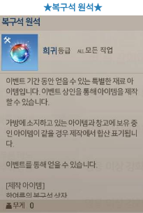 첫 번째로는 영웅 등급 이상의 장비를 강화만 해도 한여름의 복구석 상자를 제작할 수 있는 복구석 원석을 지급하는