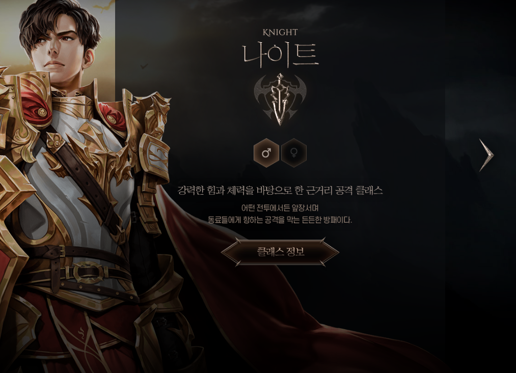 우선 나이트는 전사계열의 클래스입니다. 강력한 힘과 체력을 바탕으로 근거리 클래스 이죠.