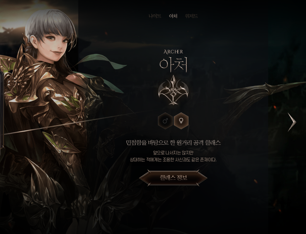 다음은 아처 클래스입니다. 민첩함을 바탕으로 한 원거리 공격 클래스입니다.