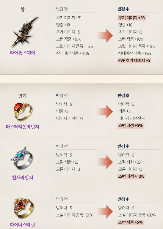 다이너스티 링 등 많은 옵션이 상향을 했습니다!