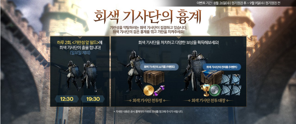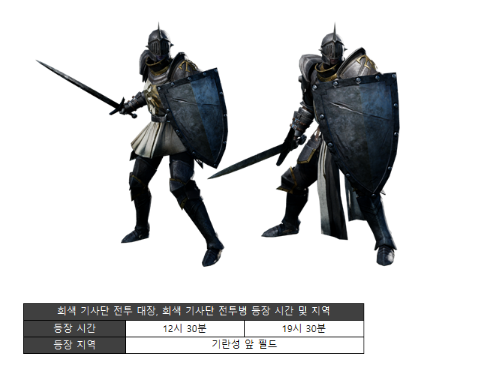 이벤트 기간 동안 12시30분,19시30분에 회색 기사단 전투 대장과 회색 기사단 전투병이