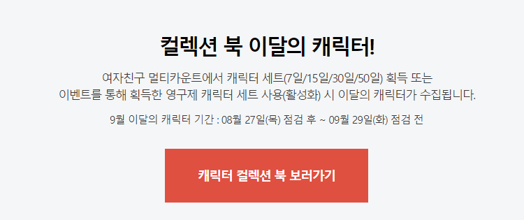9월 이달의 캐릭터 기간은 8월27일 목요일 점검 후~9월 29일 화요일 점검 전까지 입니다.
