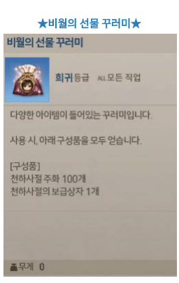 천하사절 주화100개와 천하사절 보급상자가 들어있는 비월의 선물 꾸러미를 우편함으로 보내드린다고 합니다.