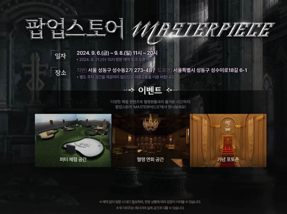 콜라보 이벤트의 하이라이트 중 하나는 9월 6일부터 9월 8일까지 서울 성수동에서 열릴 예정인 콜라보 팝업 스토어입니다. 단순히 게임 아이템만을 제공하는 것이 아닌, 실제 공간에서 유저들이 직접 체험할 수 있는 다양한 프로그램이 준비되어 있어 흥미를 더하고 있습니다. 퍼터 체험 공간과 혈맹 연회 공간, 기념 포토존 등 다양한 체험 공간이 마련되어 있으며, 유저들은 특별한 경험을 통해 리니지M과 PXG의 세계를 더욱 깊이 이해할 수 있을 것입니다.