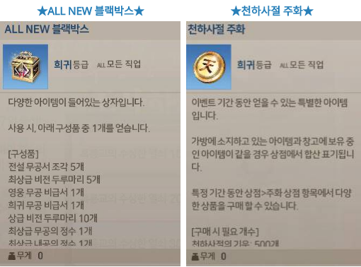 그리고 모든 의뢰를 완료하시면 다양한 아이템을 얻을 수 있는 ALL NEW 블랙박스를 지급한다고 합니다.