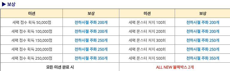 세력 몬스터 처치100/200/300/400/500 -주화 200/200/250/250/350개 획득
