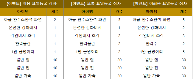 공략에 성공한 요일동굴의 난이도에 따라 요일동굴 상자가 지급된다고 합니다.
