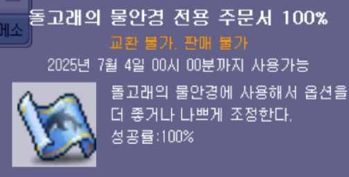 ‘돌고래 코인’ 2개로 교환 가능한 ‘돌고래의 물안경’은 눈 장식 아이템이며, 전용 주문서로 능력치를 랜덤하게 조정할 수 있습니다. 주문서는 코인 1개로 교환 가능하며, 하루 최대 5개까지 코인을 획득할 수 있기 때문에 하루에 물안경 1개와 주문서 3개 정도는 확보할 수 있습니다. 특히 이 주문서는 기존 혼돈의 주문서와 유사하게 작동하여, 스펙 업을 노리는 유저에게도 유용합니다. 다만, '돌고래의 물안경'은 8월 1일까지, 주문서는 7월 4일까지 사용 가능하므로 사용 기한을 꼭 체크해야 합니다.