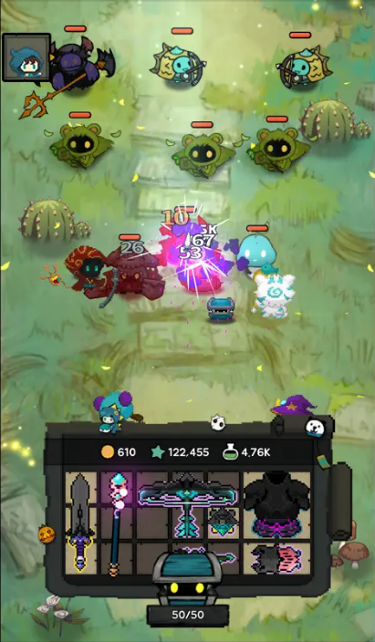 전투 자체는 자동 진행 방식이지만, 플레이어가 할 일은 분명합니다. 미믹이 토해내는 장비 아이템을 백팩 안에 효율적으로 배치하고, 같은 종류·같은 티어의 장비를 합성해 더 높은 등급으로 올리는 것이 승부의 핵심이에요. 이 ‘머지(merge)’ 요소가 단순 반복적인 방치형 게임과 다른 부분입니다.