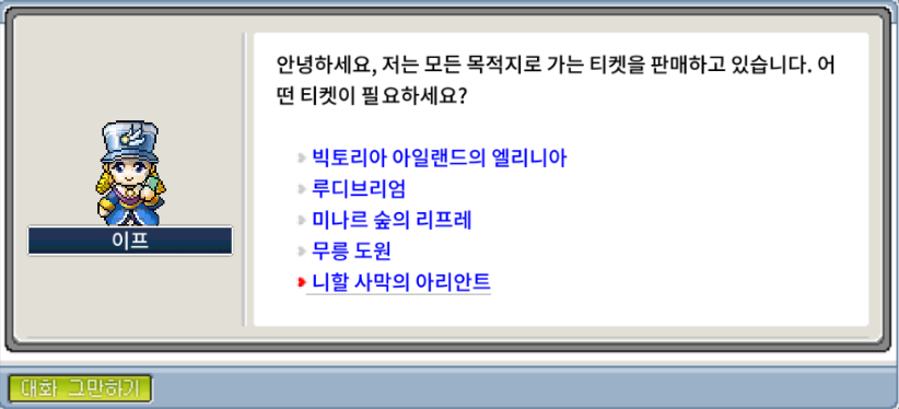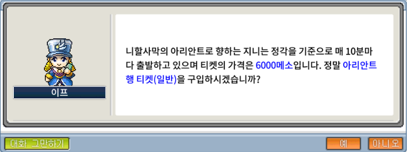 - 먼저 오르비스 정거장으로 이동해 NPC '이프'에게 말을 걸어 *아리안트행 티켓(일반)*을 구매해야 합니다. 티켓 가격은 6,000 메소입니다.