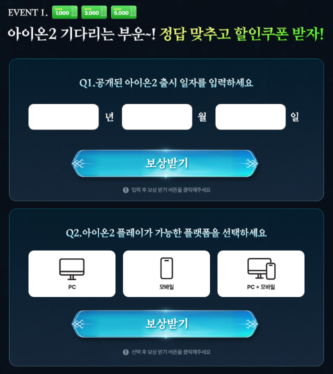 아이온2 출시를 기념하여 간단한 퀴즈를 맞히면 100% 당첨되는 이벤트입니다. 정답만 정확히 입력하면 아이온2 전용 거래 할인 쿠폰을 즉시 확보할 수 있습니다.