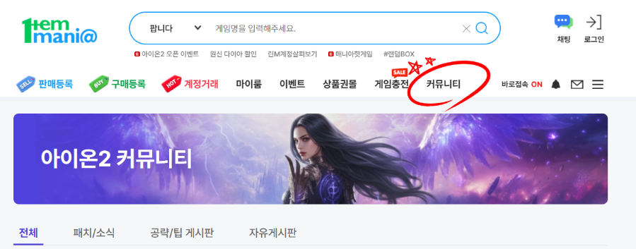 - 아이템매니아 아이온2 커뮤니티 자유게시판에 접속합니다.