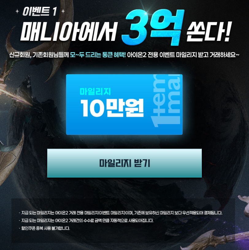 아이온2의 초반 성장에는 패키지 구매가 빠질 수 없습니다. 아이템매니아에서는 이 부분을 크게 지원하기 위해 패키지 구매 금액의 절반을 마일리지로 환급하는 이벤트를 마련했습니다.