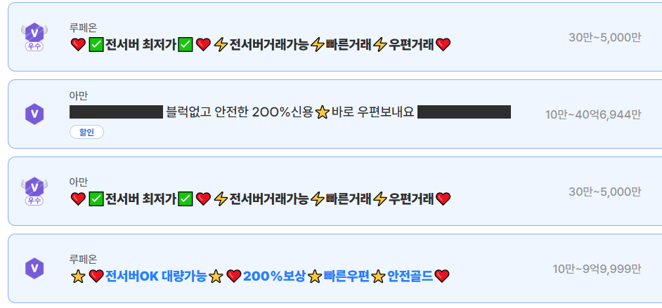 에스크로 시스템을 통해 개인 간 거래에서 발생할 수 있는 먹튀 위험을 원천 차단하며, 서버별 로아 골드 시세를 실시간으로 확인할 수 있어 안전성이 높습니다.
