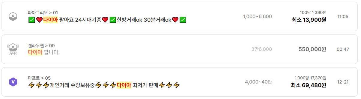 아이템매니아의 실시간 거래 리스트를 분석해 보면 다이아 시세는 서버군별로 미세한 차이를 보이지만 일정한 기준선을 유지하고 있습니다.