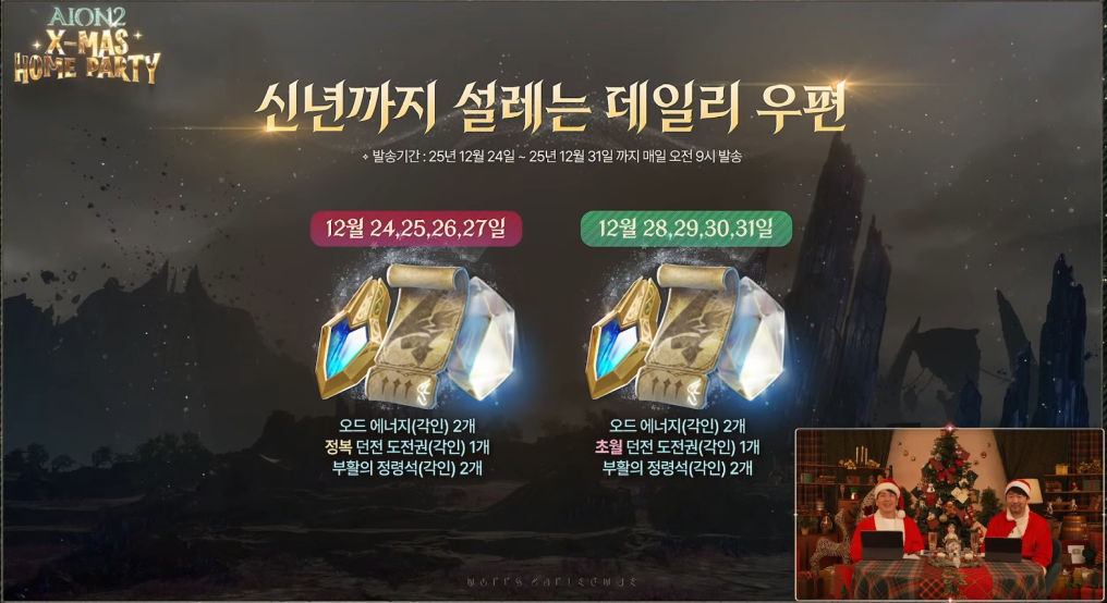 아이온2를 즐기는 유저분들에게 반가운 소식이 전해졌습니다. 지난 12월 23일 진행된 크리스마스 특집 라이브 방송을 통해 대규모 보상이 담긴 쿠폰과 향후 업데이트 계획이 공개되었습니다. 이번 방송은 시청자 수가 7만 명을 돌파할 정도로 뜨거운 관심을 모았는데요. 산타 복장을 하고 소통에 나선 개발진의 모습에서 게임에 대한 진심을 느낄 수 있었던 시간이었습니다.