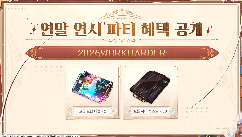 | 2026WORKHARDER | 고급 모집 티켓 2개, 모듈 하이 부스트 50개 | |