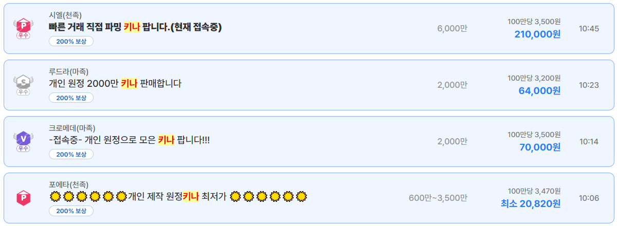 흥미로운 부분은 거래 수량이다. 과거에는 1,000만 단위의 소량 거래가 주를 이뤘다면, 최근에는 3,000만~5,000만 단위의 대량 키나 판매가 일반화되고 있다. 이는 고강화 장비, 제작, 컬렉션 등 키나 소모처가 늘어난 구조적 변화와 맞물린 결과다. 특히 ‘본캐 인증 가능’, ‘개인 사냥’ 문구는 구매자 신뢰도를 높이는 핵심 요소로 작용하고 있다.