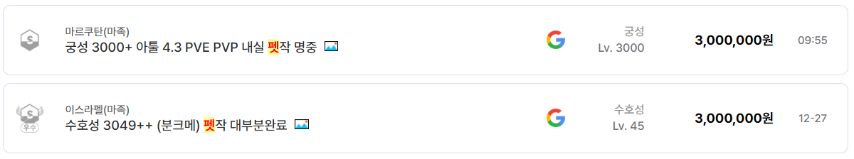 또한 봉던, 주둔지, 펫작을 대행해주는 작업 상품이 8만 원 단위로 지속적으로 등록되는 점도, 직접 플레이보다는 시간 절약형 소비가 보편화되었음을 보여준다.
