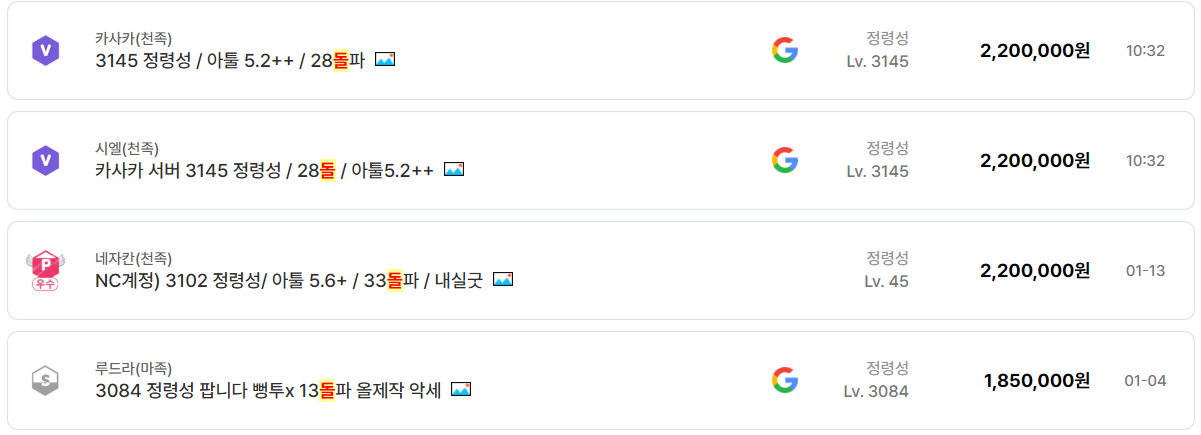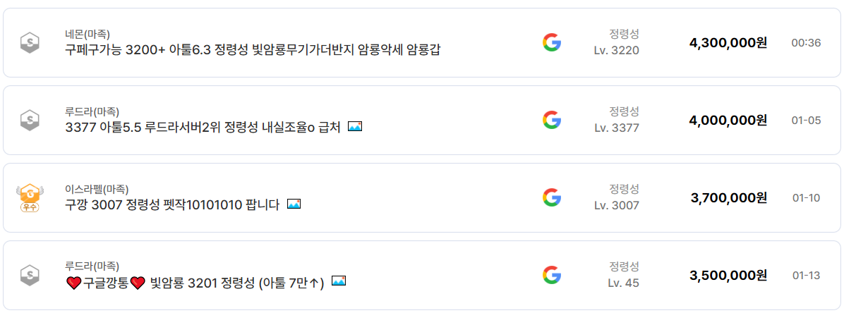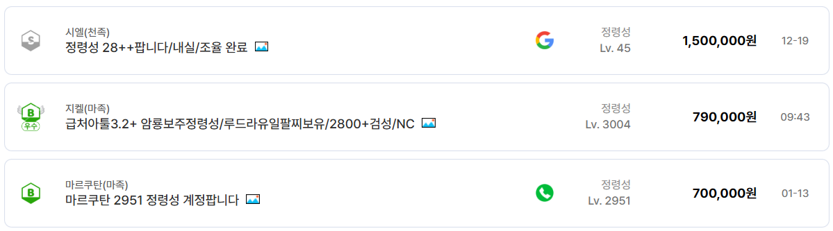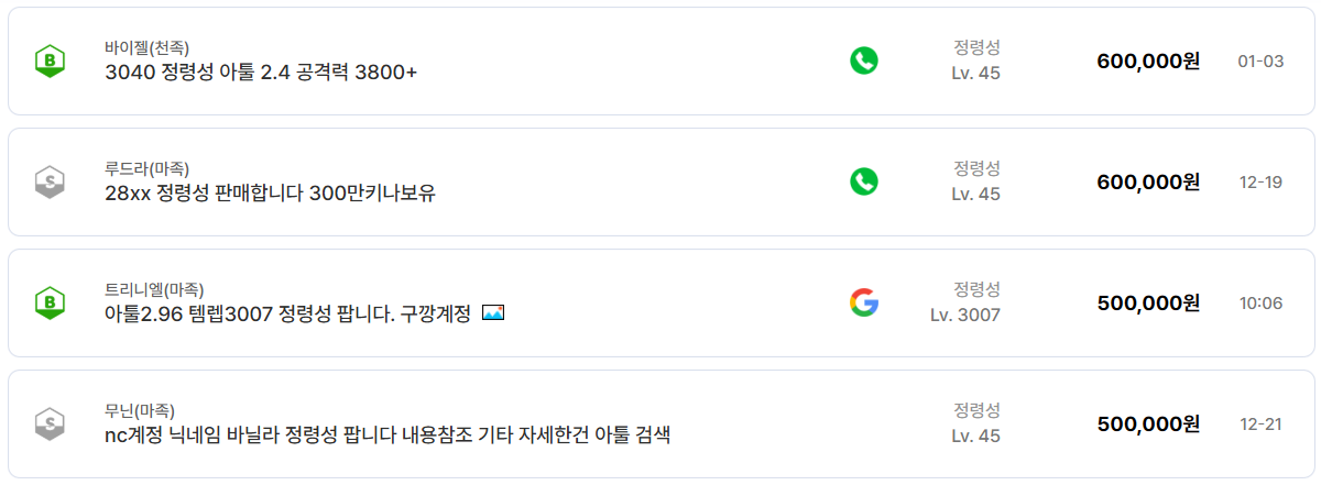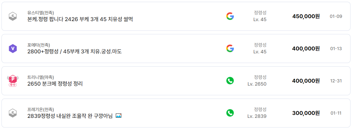 결국 가격을 결정하는 요소는 서버가 아니라 스펙이며, 동일한 투력과 아툴을 가진 정령성 계정은 어느 서버든 유사한 금액대에서 거래된다.