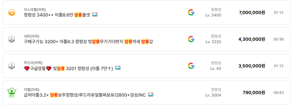 암룡 무기, 암룡 악세, 암룡 방어구는 여전히 최상위 스펙의 상징이며, 단일 아이템 하나만으로도 계정 가격이 수백만 원 단위로 차이 난다.