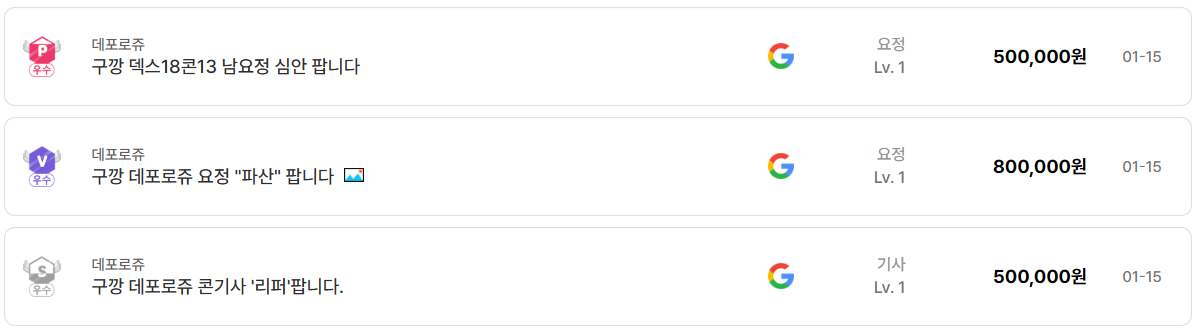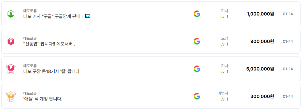 계정 상태 역시 중요한 판단 기준이다. 거래 내역을 보면 ‘구글 깡계’, ‘구깡 계정’이라는 표현이 자주 등장한다. 연동 이력이나 과금 내역이 없는, 소위 말해 가장 안전하다고 인식되는 계정을 의미한다. 리니지 클래식은 계정 보안과 관련된 이슈에 민감한 유저층이 많기 때문에, 깔끔한 계정 상태는 곧 가격 상승 요인으로 작용한다.