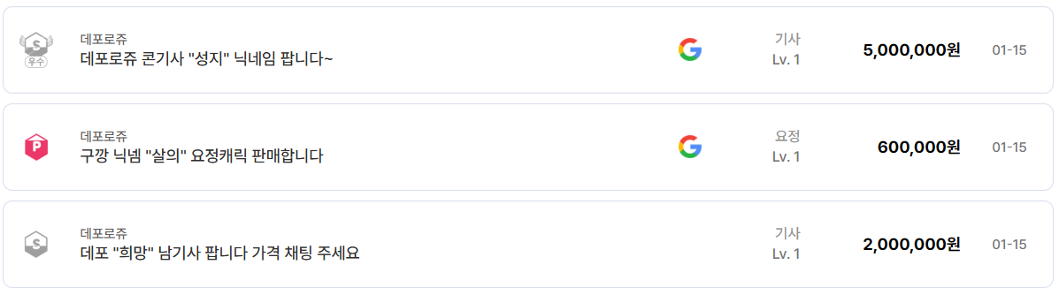 가장 눈에 띄는 부분은 ‘닉네임 가치’다. 데포로쥬 서버에서 거래된 목록을 보면 1글자 닉네임, 의미가 강한 단어형 닉네임, 과거 혈맹명이나 상징성을 가진 닉네임들이 반복적으로 등장한다. ‘성지’, ‘부처’, ‘여정’, ‘단련’, ‘살기’, ‘암습’과 같은 닉네임은 단순한 캐릭터명이 아니라, 서버 내에서 인지도를 형성할 수 있는 자산으로 취급된다.