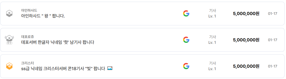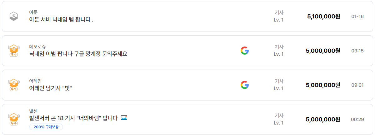 최근 아이템매니아에 실제로 등록되고 거래된 내역들을 살펴보면, 기사 계정이 왜 리니지 클래식 계정 거래의 중심축으로 유지되는지 명확하게 드러난다.