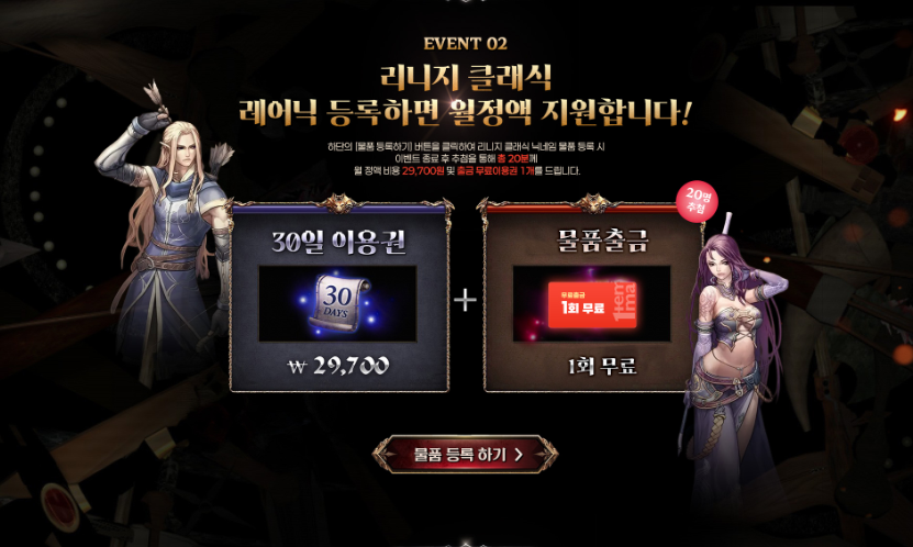 리니지 클래식은 월정액 기반으로 운영될 예정인 만큼, 이용료에 대한 부담을 덜 수 있는 아주 매력적인 이벤트입니다. 레어 닉네임을 판매 등록만 해도 응모가 완료됩니다.
