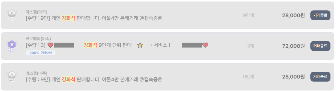 대량 거래의 경우 단가가 더 낮아지는 경향도 뚜렷하다. 예를 들어 45만 개를 8만 원대, 50만 개를 8만~9만 원대에 판매한 사례들이 다수 확인된다. 이는 배럭이나 원정 캐릭터를 활용해 장기간 모은 강화석을 한 번에 정리하는 판매자가 많다는 의미로 해석할 수 있다. 실제로 판매 문구에서도 ‘배럭으로 모은 강화석’, ‘개인 강화석’, ‘본캐 거래’라는 표현이 반복적으로 등장한다.