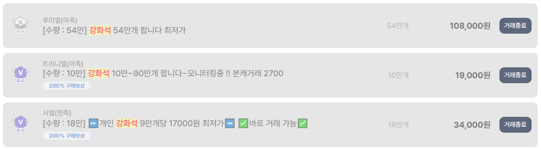 우선 최근 거래 데이터를 보면 강화석은 대부분 9만 개 단위로 거래되고 있으며, 이를 기준으로 가격이 형성되고 있다. 가장 많이 확인되는 구간은 9만 개당 1만7천 원 ~ 2만 원대다. 시엘, 아리엘, 트리니엘 서버를 중심으로 9만 개 1만8천 원 전후의 거래가 다수 완료되었고, 루미엘, 이스할겐, 카이시넬 등에서도 비슷한 가격 흐름이 반복적으로 나타난다.