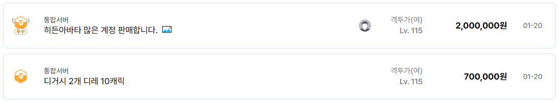 또 하나 주목할 부분은 태거시, 디거시, 히든 아바타 보유 여부입니다. 디거시 2개, 디레 10캐릭을 보유한 계정은 70만 원에 등록되었고, 히든 아바타를 다수 보유한 계정은 200만 원 선에서 거래가 진행되고 있습니다. 이는 순수 딜 수치 외에도 외형 가치와 희소성이 가격에 큰 영향을 미친다는 것을 보여주는 대표적인 사례입니다.