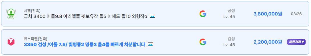 천족 진영에서는 시엘, 유스티엘 서버가 상대적으로 거래 빈도가 높다. 시엘 서버 궁성 3400대 계정은 아툴 9.8, 아리엘 풀세트, 펫 보유, 이해도 및 외형 작업까지 완료된 상태로 380만 원에 빠르게 거래되었으며, 유스티엘 서버 검성 3350 계정은 명룡·빛명룡 세팅과 4돌 구성에도 불구하고 220만 원에 급처 형태로 등록되어 빠른 거래가 이루어졌다. 이는 동일 전투력대라도 클래스와 장비 완성도에 따라 가격 차이가 크게 발생한다는 점을 보여준다.