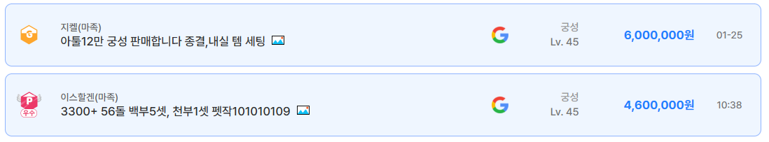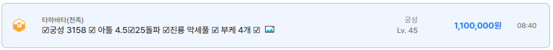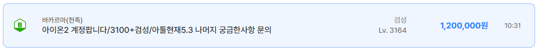 반면, 비교적 낮은 전투력 구간에서는 진입 장벽을 낮춘 계정들이 활발하게 거래된다. 바카르마 서버 천족 검성 3100대 계정은 120만 원, 타하바타 서버 궁성 3158 계정은 진룡 악세 풀세트와 부캐 다수 보유 조건으로 110만 원에 거래되었다. 이는 신규 혹은 복귀 유저가 빠르게 콘텐츠에 적응하기 위한 선택지로 이러한 계정이 활용되고 있음을 의미한다.